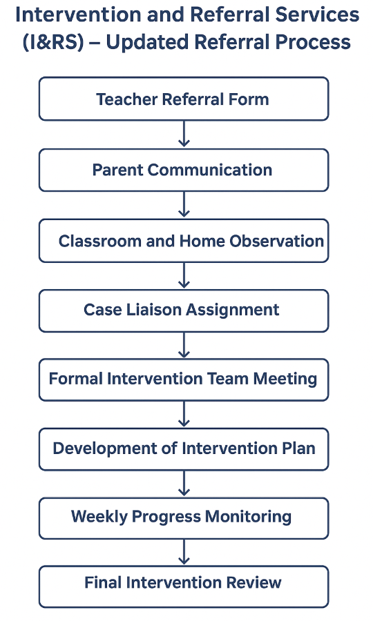 The pre-referral process ensures that interventions are data-driven, research-based, and closely monitored, helping the I&RS team and classroom teachers implement strategies that improve overall instructional quality.